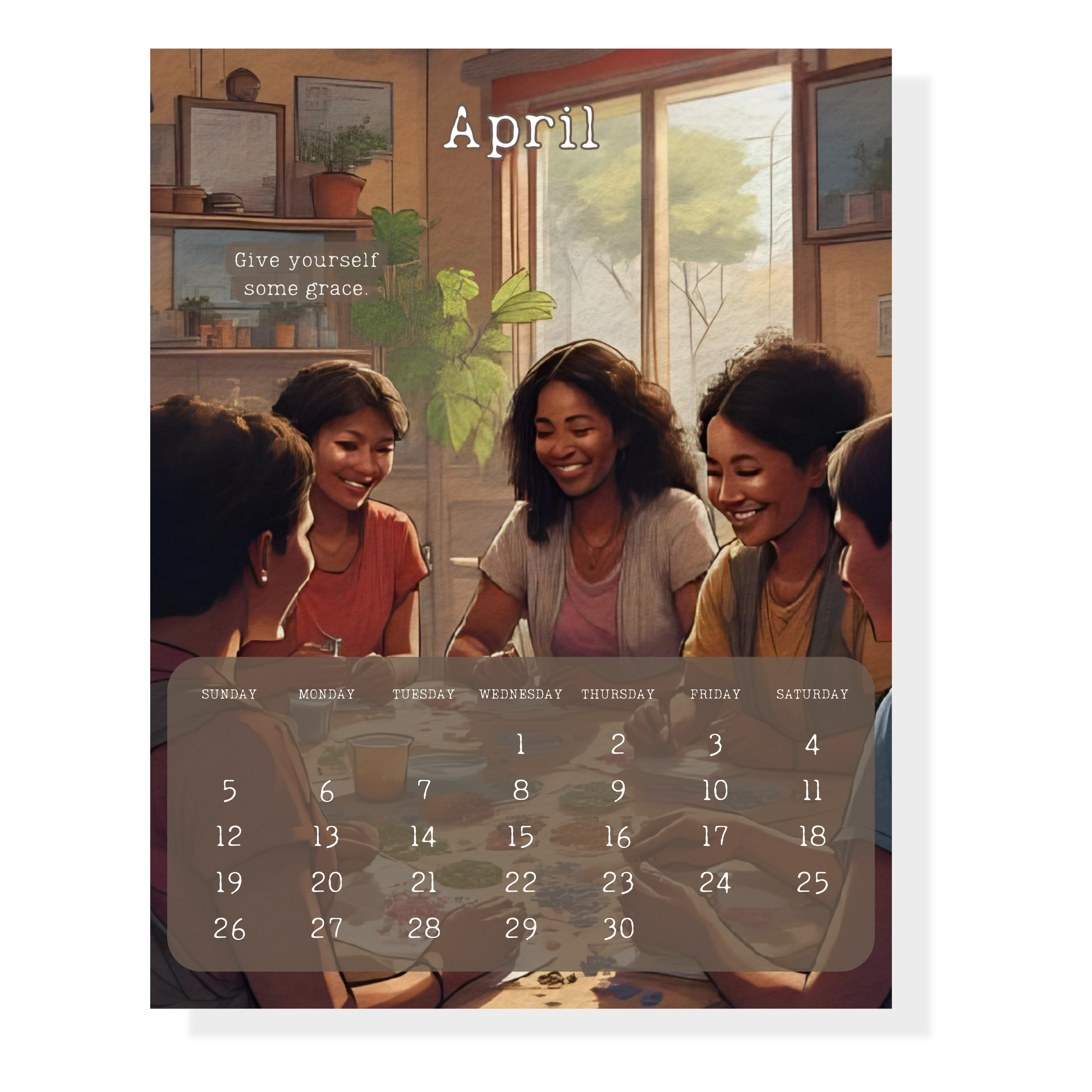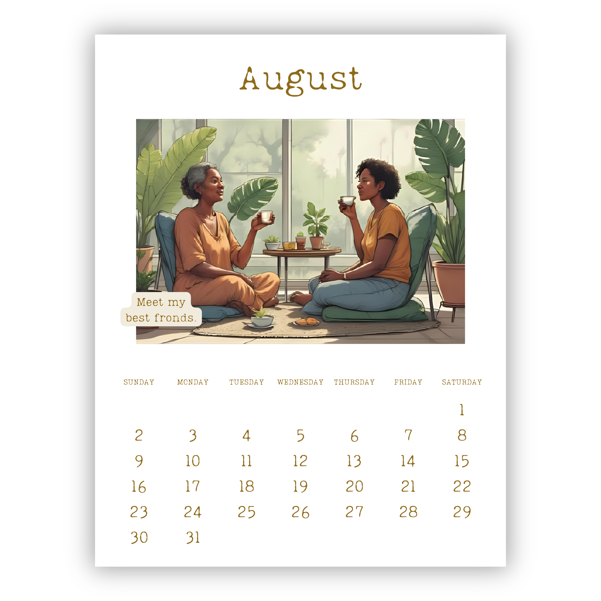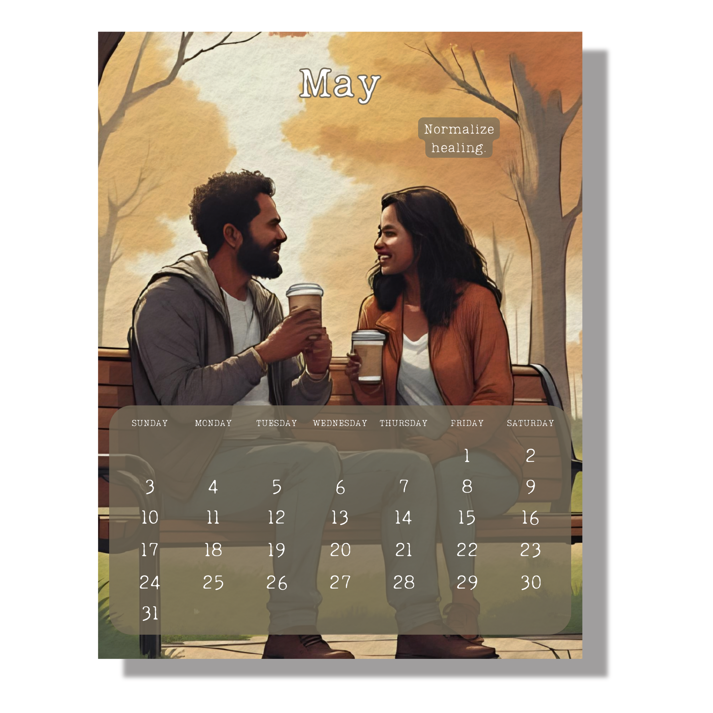 A celebration of resilience and empowerment through community, this wall calendar is designed to support mental health and wellness. Printed on matte cardstock and measuring 8.5" x 11", it blends aesthetic elegance and practicality. Each month features inspiring affirmations and artwork that encourage daily reflection and personal growth.
