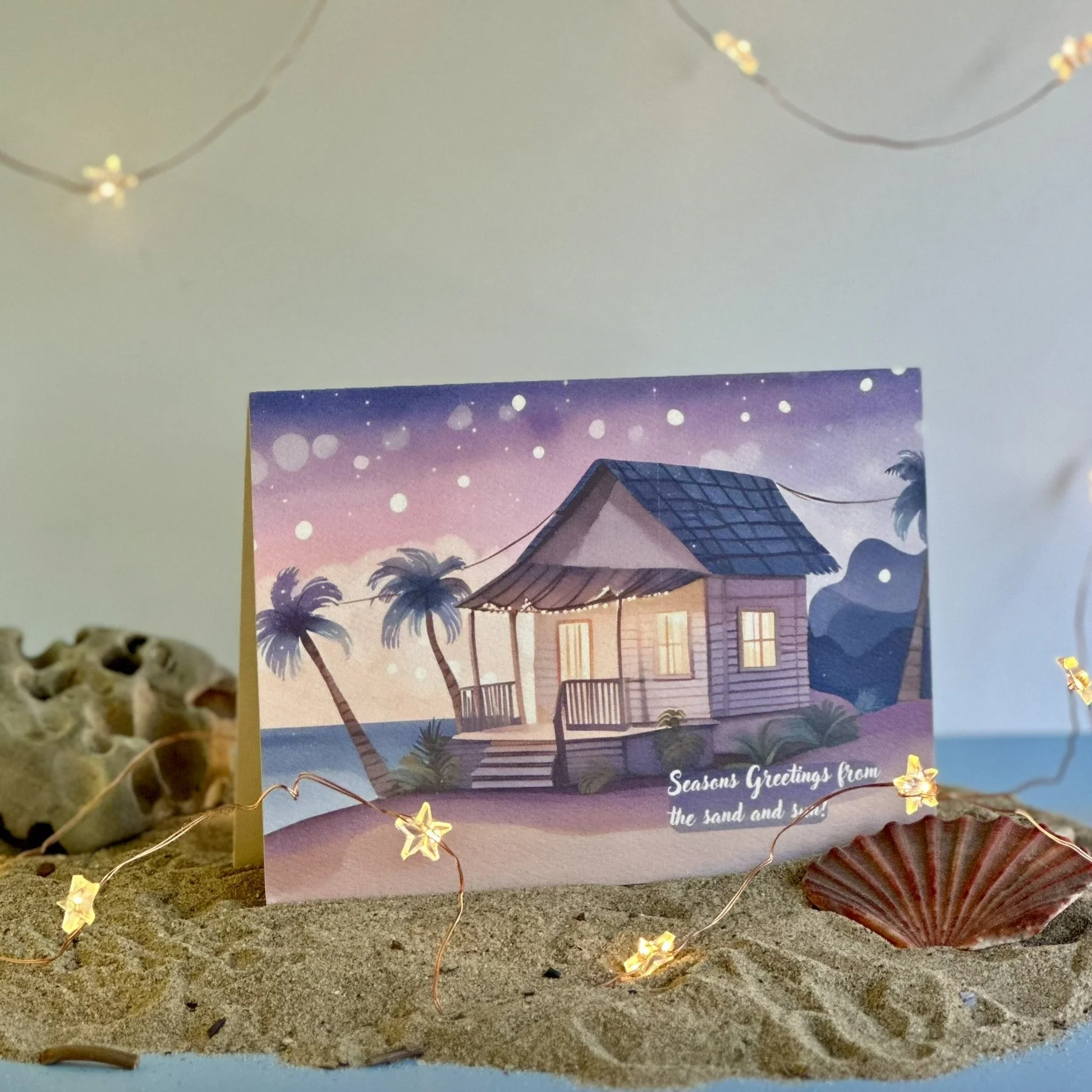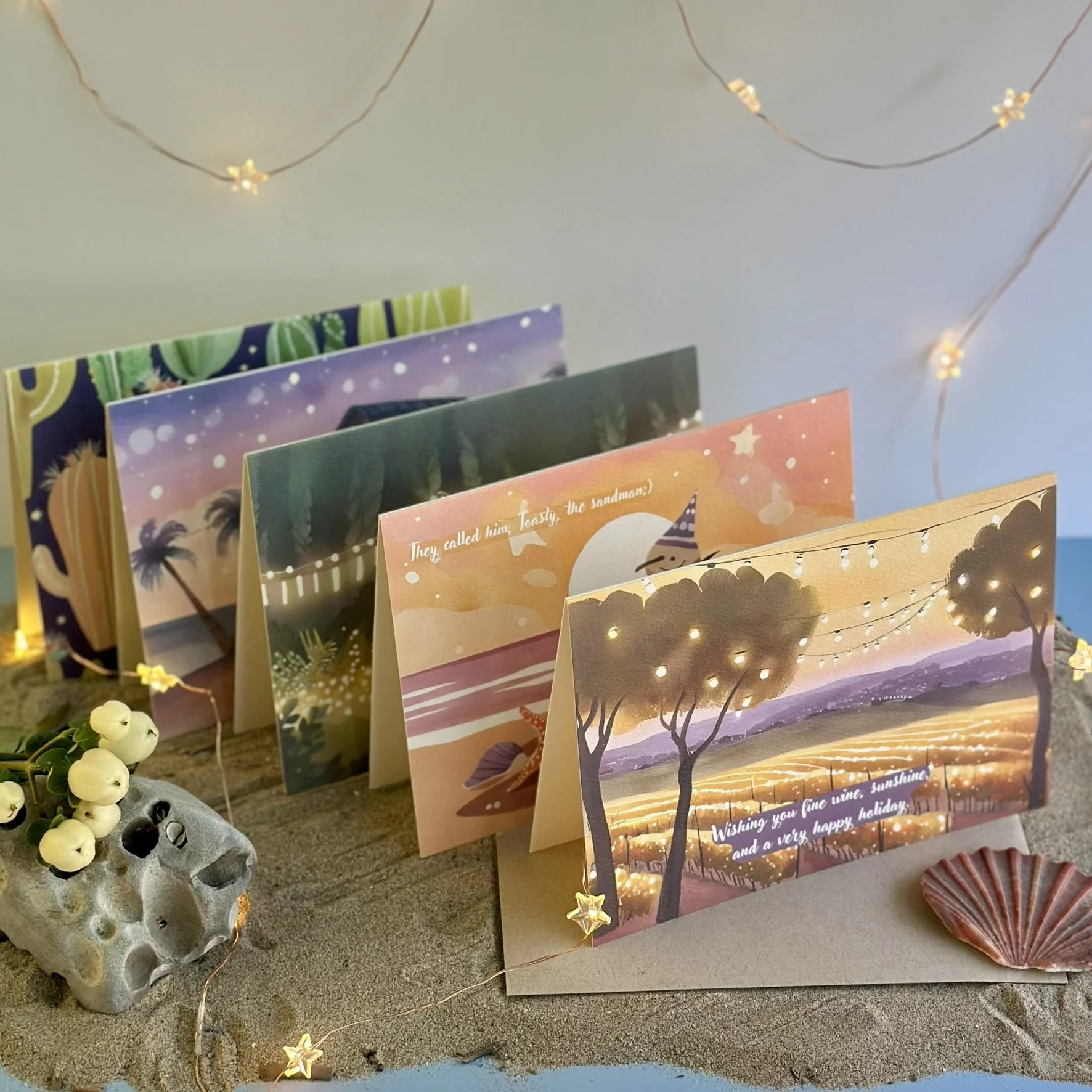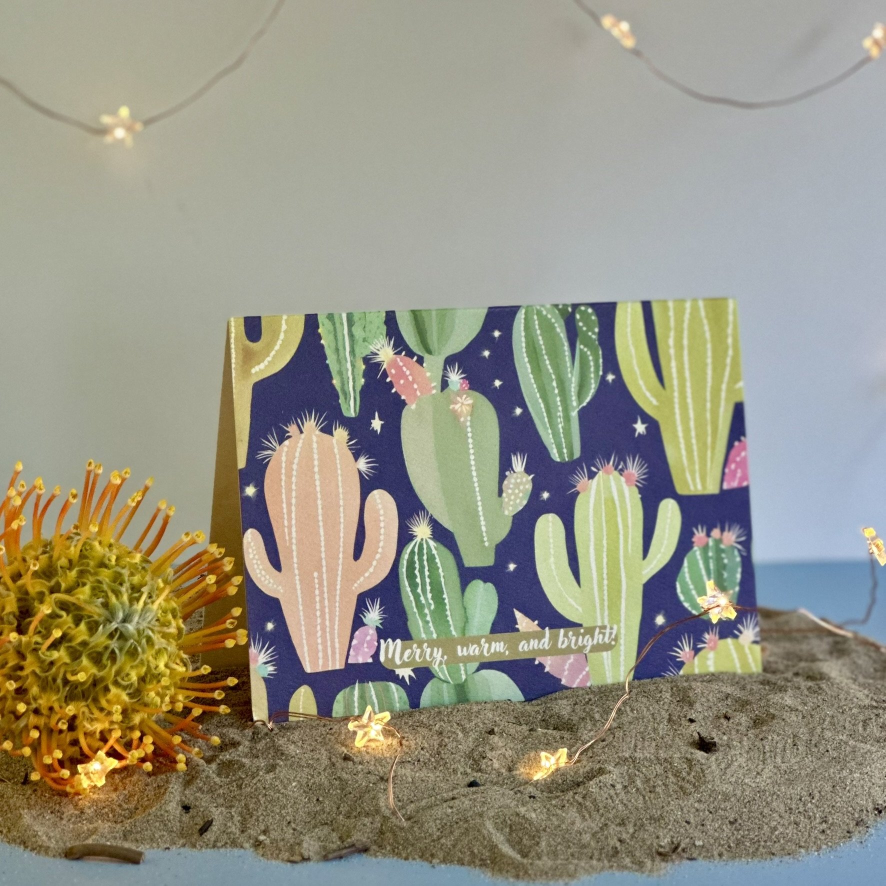A charming collection of holiday cards designed for those who live (or wish they lived) in sunny climes. From holiday cacti to a cheerful “sandman,” this delightful set of five (5) 4.5"x6.25" folded cards is printed on luxurious 100# natural felt-weave paper and accompanied by five Kraft Speckletone envelopes. They’re perfect for spreading joy and sunshine to friends and family at the holidays.