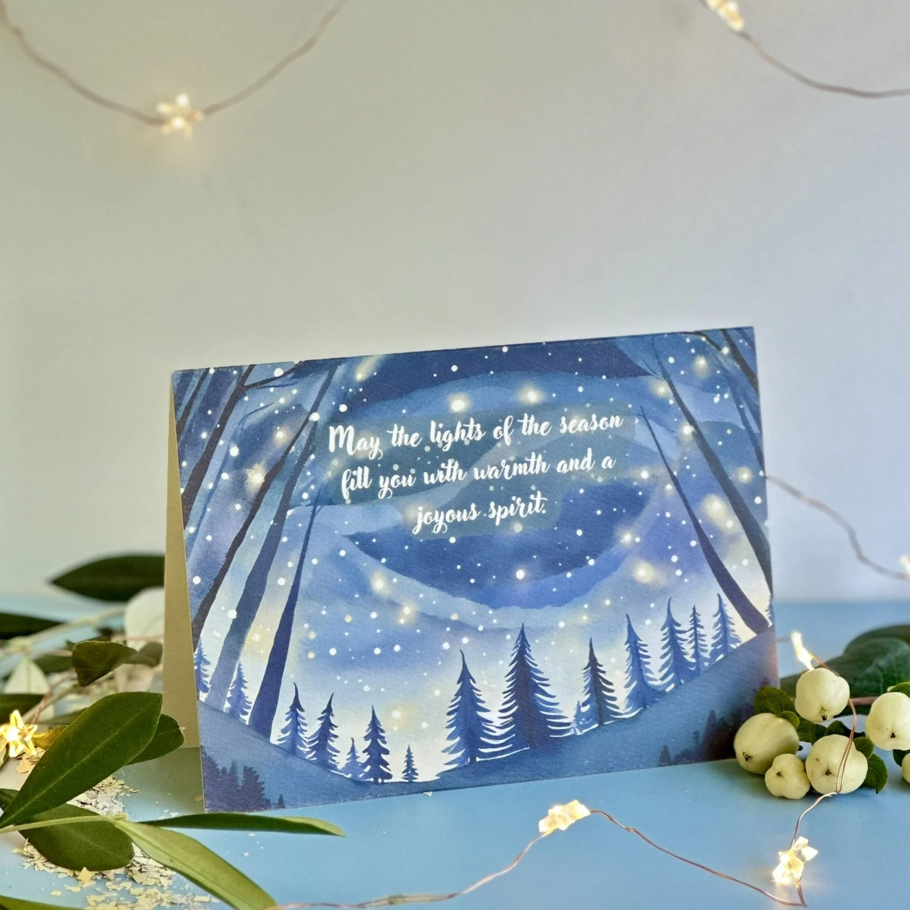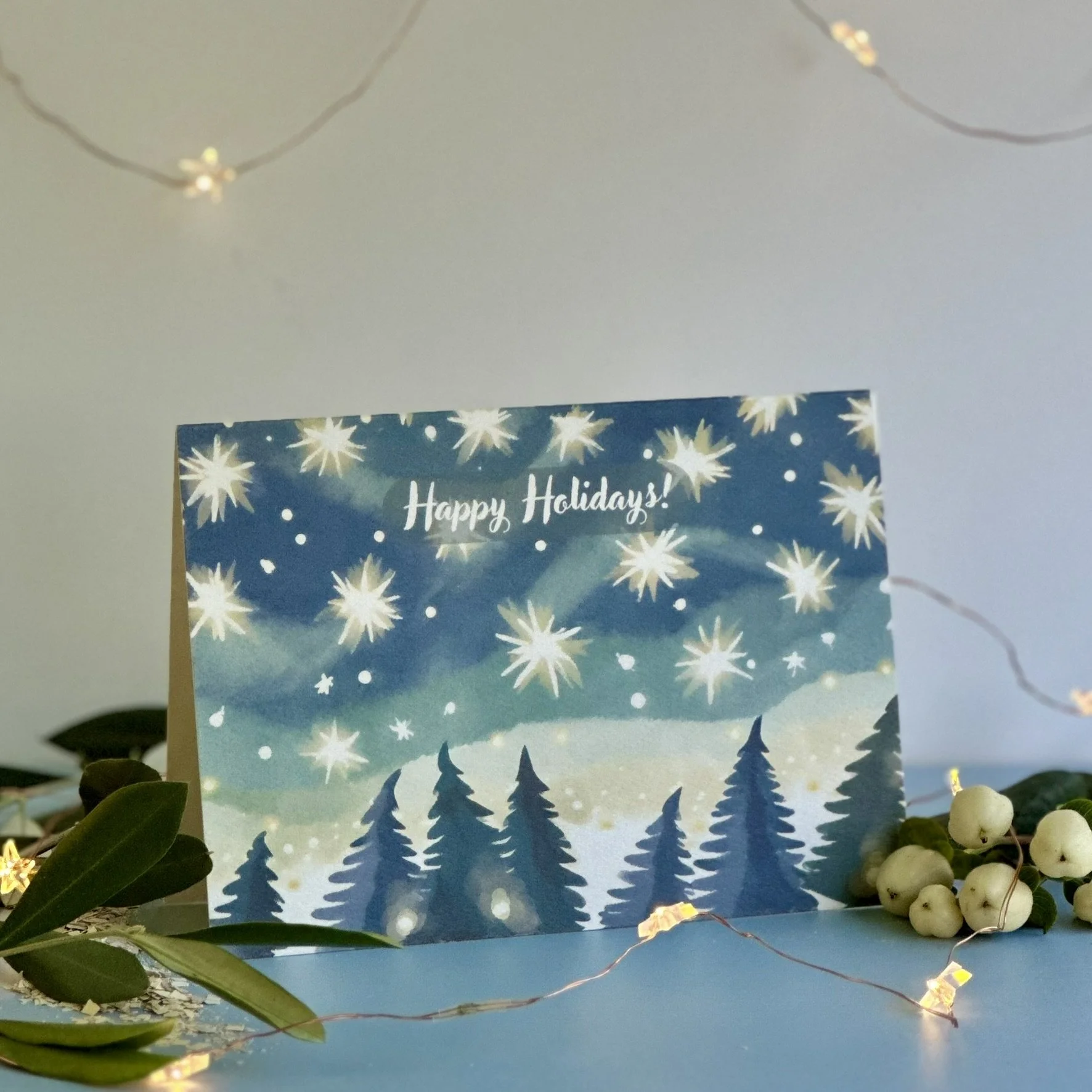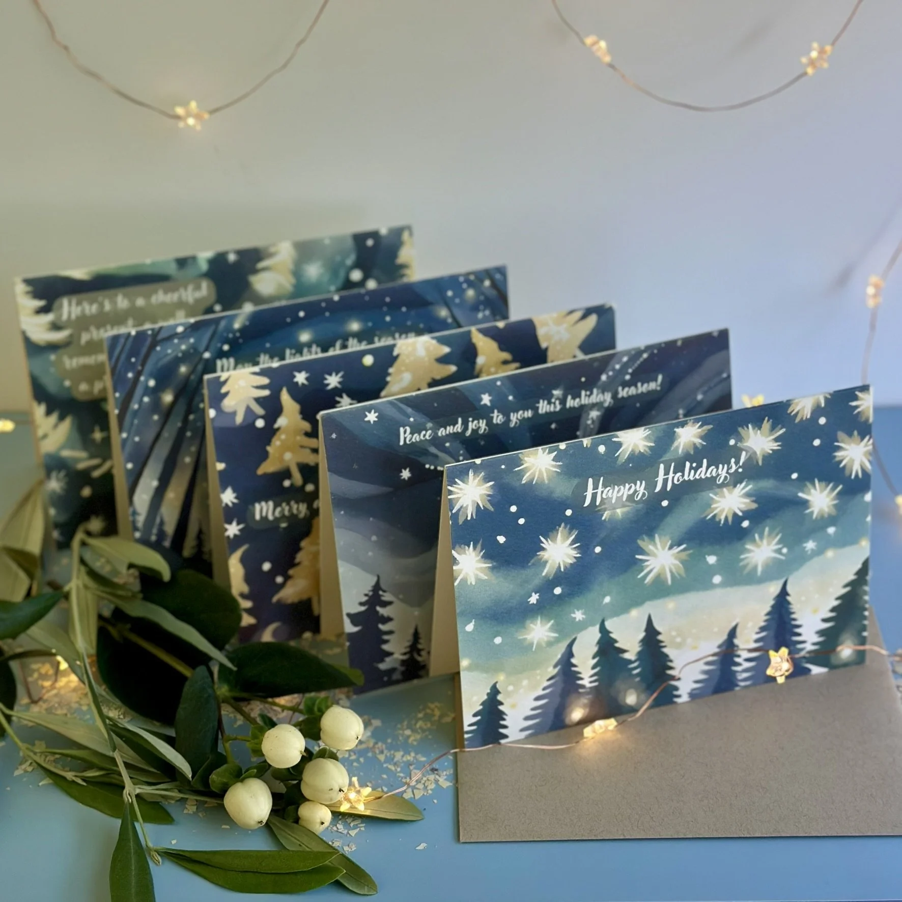 Celebrate the season with this warm and cozy set of five (5) holiday cards. Measuring 4.5" x 6.25" when folded, the cards are crafted from 100# natural felt-weave paper and paired with a rustic Kraft Speckletone envelope. Whether you're sending warm wishes or a sprinkle of holiday magic, these cards are sure to bring a smile to anyone's face!