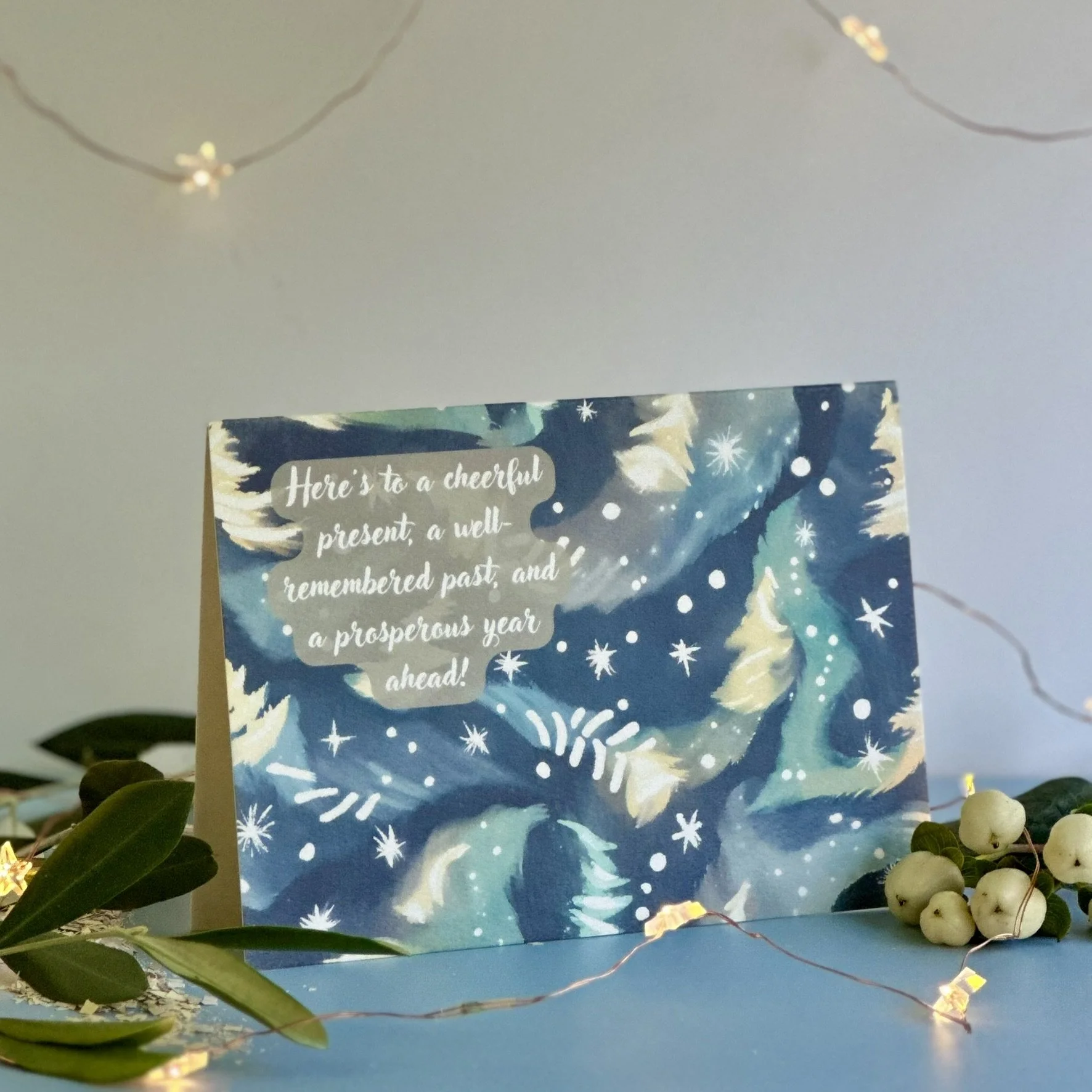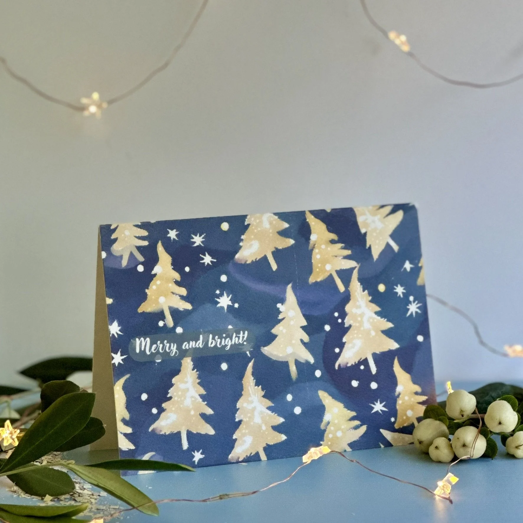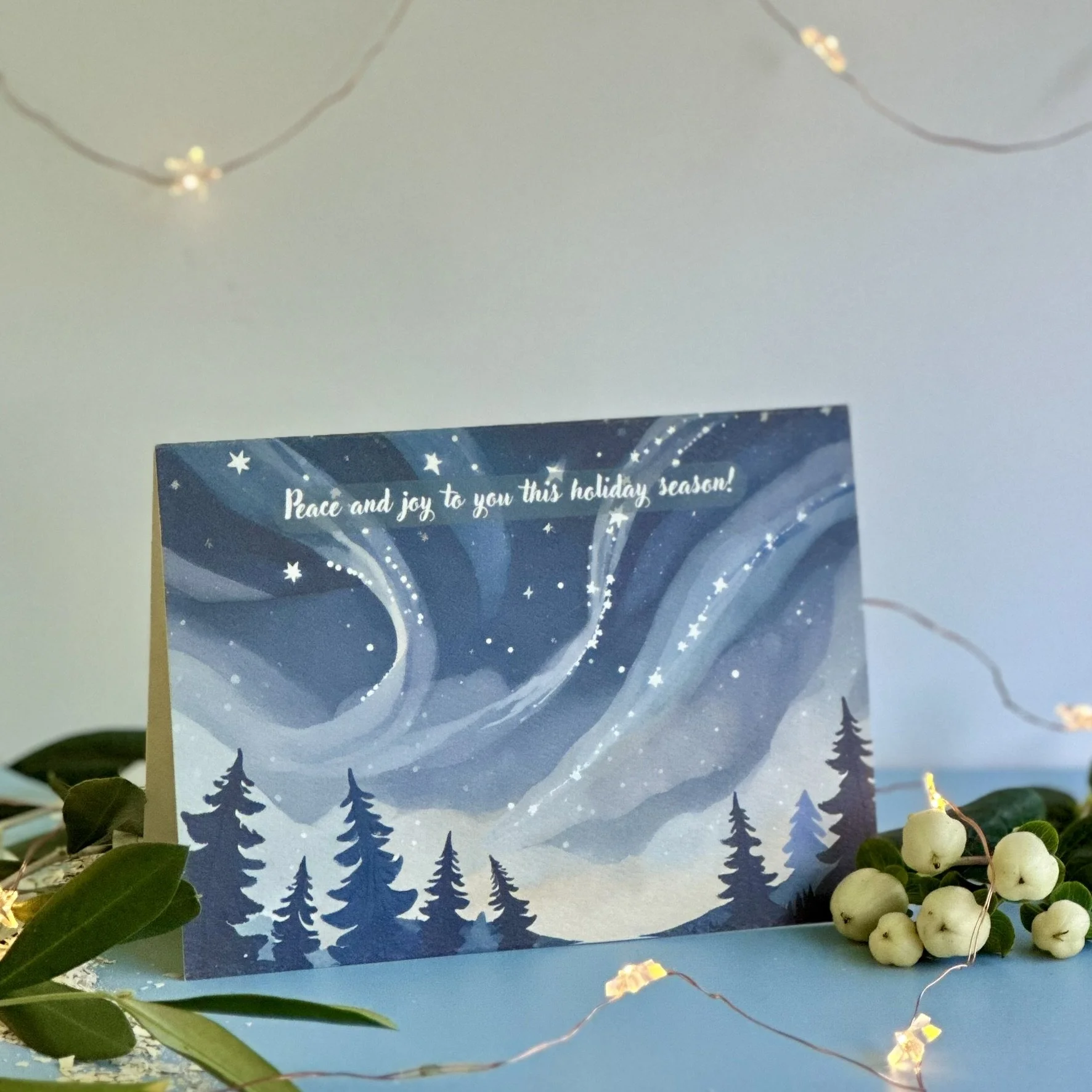 Celebrate the season with this warm and cozy set of five (5) holiday cards. Measuring 4.5" x 6.25" when folded, the cards are crafted from 100# natural felt-weave paper and paired with a rustic Kraft Speckletone envelope. Whether you're sending warm wishes or a sprinkle of holiday magic, these cards are sure to bring a smile to anyone's face!