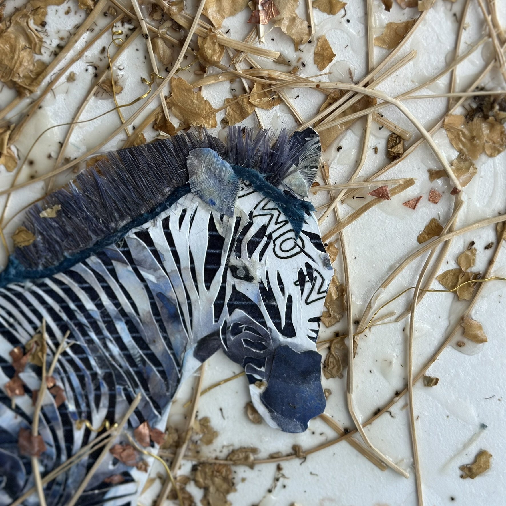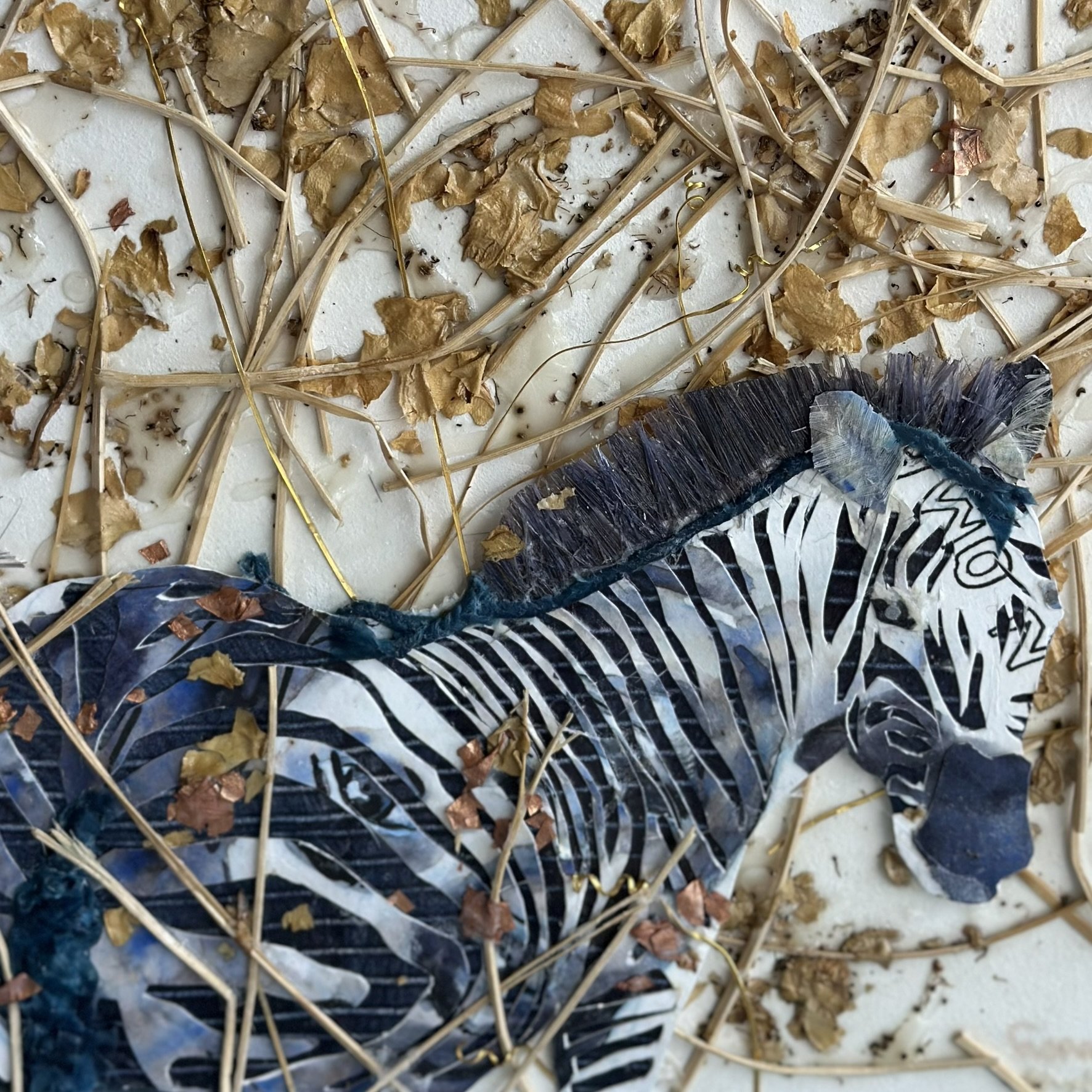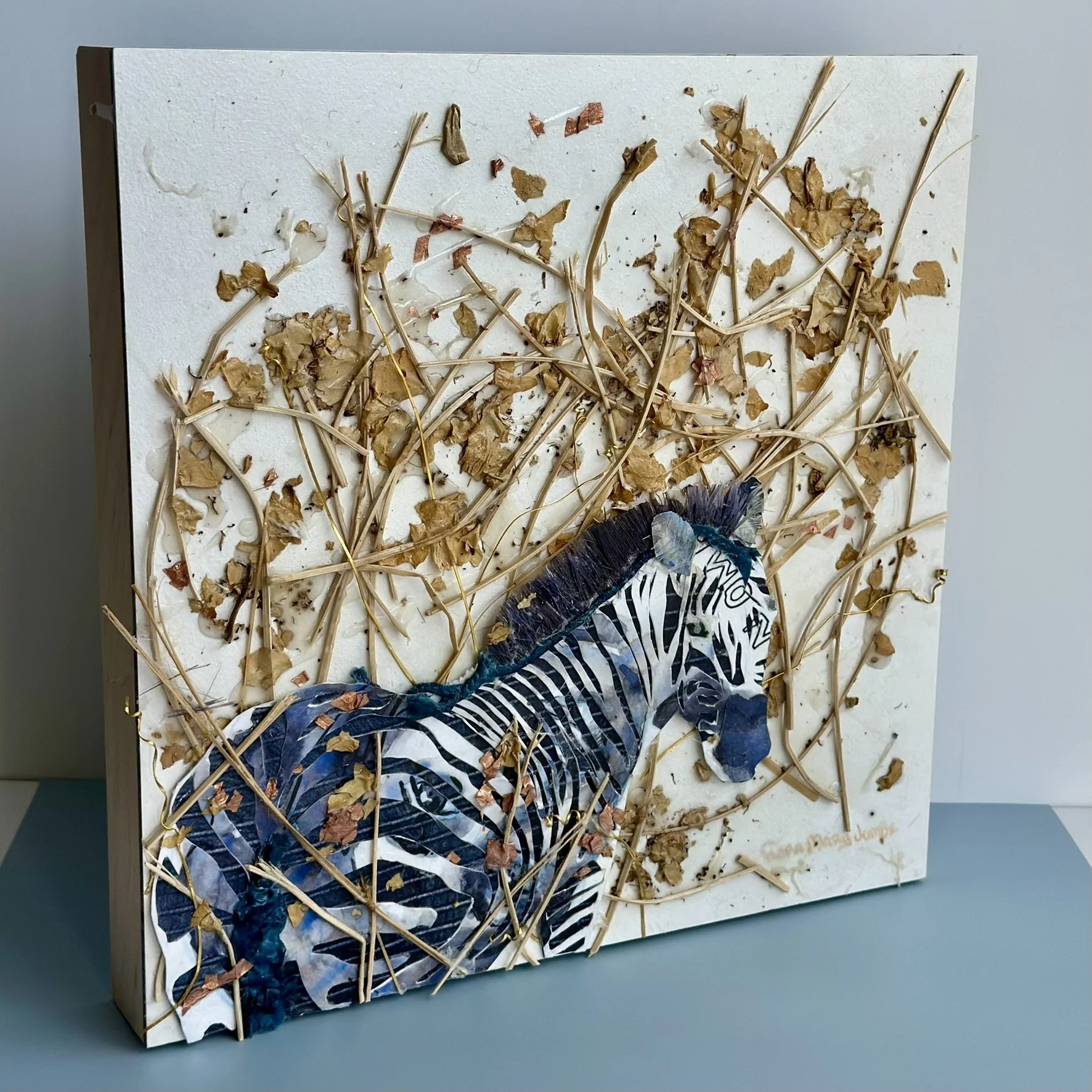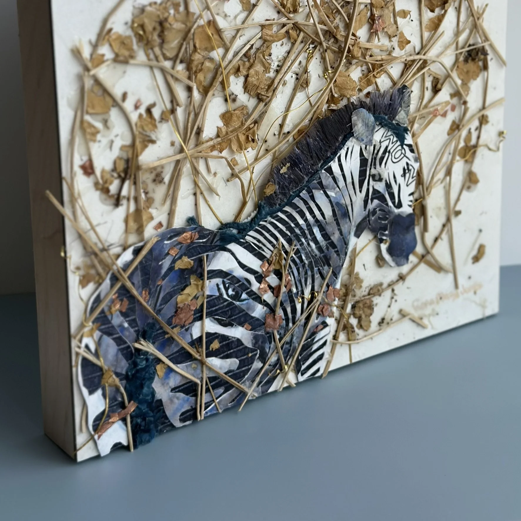 This captivating mixed media art piece brings the majestic zebra to life within its natural habitat, blending textures and colors to evoke the vibrant landscape of Tanzania's renowned Ngorongoro Conservation Area. Constructed on Ampersand Aquabord, the zebra was cut from old calendar paper and embellished with silk ribbon and bits of cloth. For the backing, I combined wall paper, dried flower petals, wire, and pieces of broken wicker. This piece is the second in a series inspired by the photographs in an old travel book and my childhood memories of Malawi.