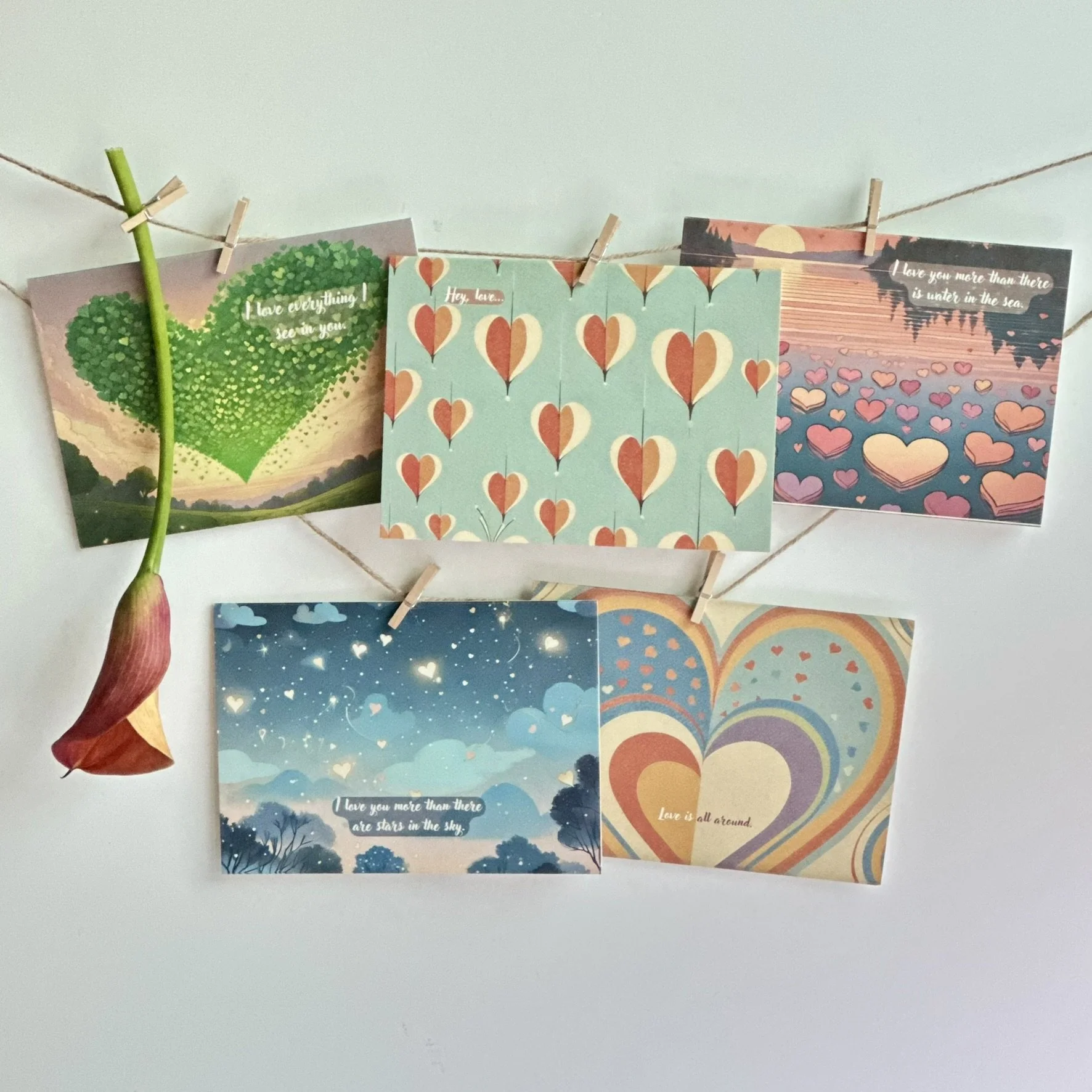 These five (5) beautiful Valentine’s Day cards are perfect for reminding a partner, friends, and family members that they are loved and cherished. Each 4.5" x 6.25" card is crafted from luxurious 100# natural felt-weave paper and paired with matching Kraft Speckletone envelopes. These special cards are not just a token of love, but a keepsake to hold dear.